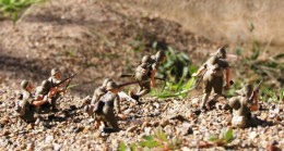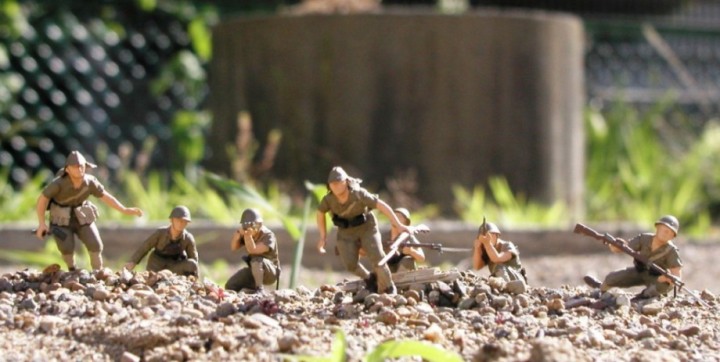 田宮社製の35分の1スケールの日本陸軍歩兵セットである.当時150円から250円位であった(値段のばらつきは製造時期による).構成は軍刀を持った将校が1体と兵が3体である.熱帯用の服装で,明らかに南方軍所属の部隊と考えられる.解説書に兵が所持している銃が三八式と記してあることから大陸から南方に転戦した部隊と思われる(太平洋戦争時の陸軍の制式銃は九九式であったが,