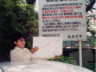 | 富山県に入ると蜃気楼で有名な魚津市や滑川市を通り10時頃に富山市に至った.さらに車を走らせ,次第に周囲の車が石川ナンバーに変わっていく中,石川県に突入(この頃石川県は”石56”のナンバーが多く,Nは石ころナンバーと呼んでいた),一気に金沢市に向かった.11時過ぎに金沢市に入り金沢大学に到着したのは11時30分位であったか.