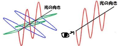 偏光というのは読んで字のごとく,偏った(かたよった)光です.光は波であるということはよく知られています(以前量子論を勉強した方は「光は粒子じゃないのか?」と突っ込むかもしれませんが 笑).太陽光や蛍光灯の光など普段私たちが目にしている光は,縦横斜めいろんな方向の波の光が集まってできています.それに対して何らかの方向にのみ揃った波を偏光と呼ぶのです.下の絵で左側が色々混じった自然光,右が方向が揃った偏光です.