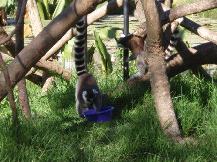 園内には大きな池があり,ここで水生植物も展示されていたが(湿地帯に生えている,巨大な葉のサトイモ科の植物,エレファント・イヤーがよく目立つ),その内部に設けられた小島にも,原猿類が展示されていた.ここにはシロクロエリマキキツネザルとワオキツネザルがそれぞれ展示され,エリマキキツネザルはどうやらバナナを食べていたようである(彼らの姿は,まるで着ぐるみのようである).ワオキツネザルも,洗面器のような食器で何やら食べていたようである.