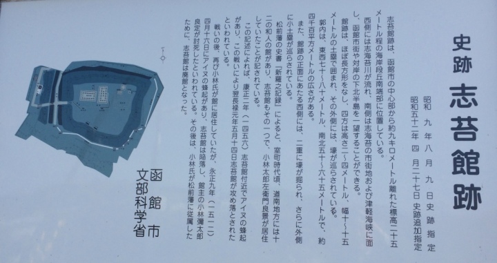 近代以前,北海道は蝦夷地と呼ばれアイヌの居住する土地であったが,室町時代以降今の渡島半島に移住する和人が増加した.後の松前藩の歴史書である「新羅之記録」によると,当時の渡島半島沿岸部には和人支配の拠点となる12の館が置かれていた.これが道南十二館で,日本海側の上ノ国町の花沢館や比石館など,渡島半島沿岸部にほぼ等間隔に並んでいる.今回のテーマ志苔館はこの十二館のうち最も東に位置するものである.