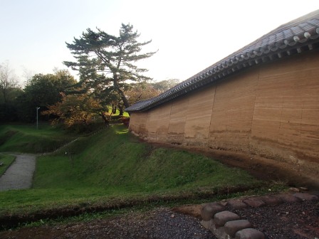 現在秋田城は東門とその周囲の築地(外郭を構成している弊)と東大路の一部,さらに城外南東の鵜ノ木地区に存在した当時としては画期的な水洗式の厠(トイレ),沼地などが復元されています.