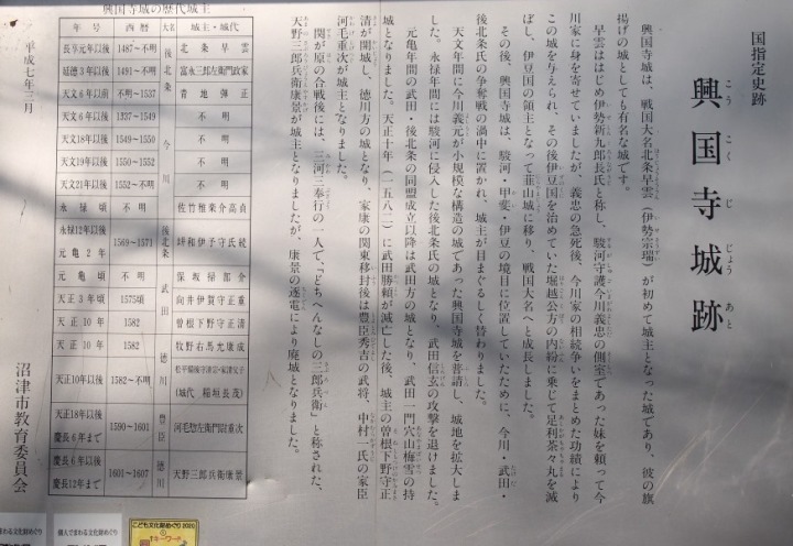 その後戦国時代が本格化すると興国寺城は今川,北条,武田3国の勢力がぶつかる最前線となり3国の政治情勢により支配者が入れ替わった.まず天文六年(1537年)に早雲の子北条氏綱が起こした第1時河東の乱の結果,永禄十一年(1568年)まで約30年間今川氏の支配となった.この時代に様々な普請が行われたとされる.途中永禄三年(1560年)に今川家の当主義元が桶狭間の戦いで敗死すると今川氏の勢力は徐々に衰退,永禄十一年に武田信玄の駿河侵攻を受けて今川の援軍として参戦した北条氏康が興国寺城を占領しそのまま自軍に組み入れてしまった.その後元亀二年(1571年)に北条氏と武田氏との同盟が成立すると今度は武田氏に引き渡され,以後天正十年の同氏滅亡までその領土であった.