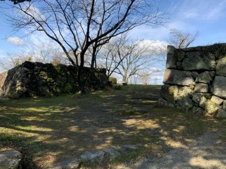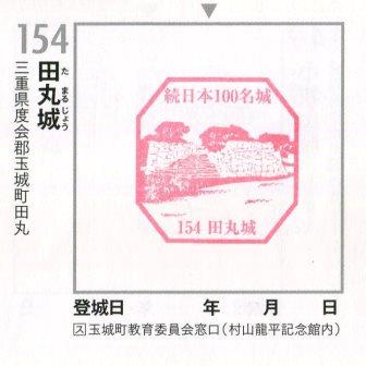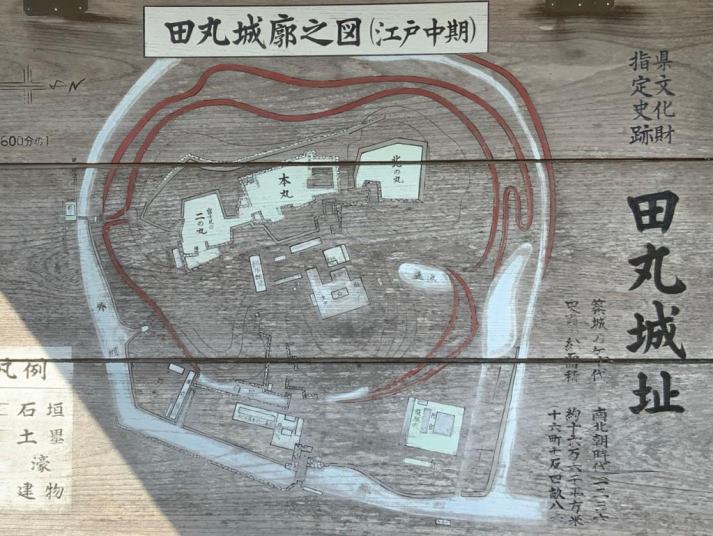 江戸時代の田丸城は基本的に織田信雄時代の縄張りを維持発展させたものと思われており,西の小高い丘に本丸がその北側に北の丸,南側に二の丸が置かれた連郭式山城の部分とその東方に屋敷などが配置された平城の部分からなる平山城である.明治維新後廃城となりほとんどの建築物が撤去され,城内も破却が進んだ.現在東側の平城部分には玉城町役場や玉城中学校,村上龍平記念館などが建っている.一方で西の山城部分は石垣や曲輪などが良い状態で保存されており往時の姿をしのぶことができる.. |