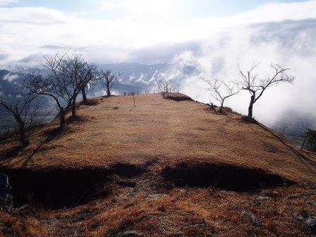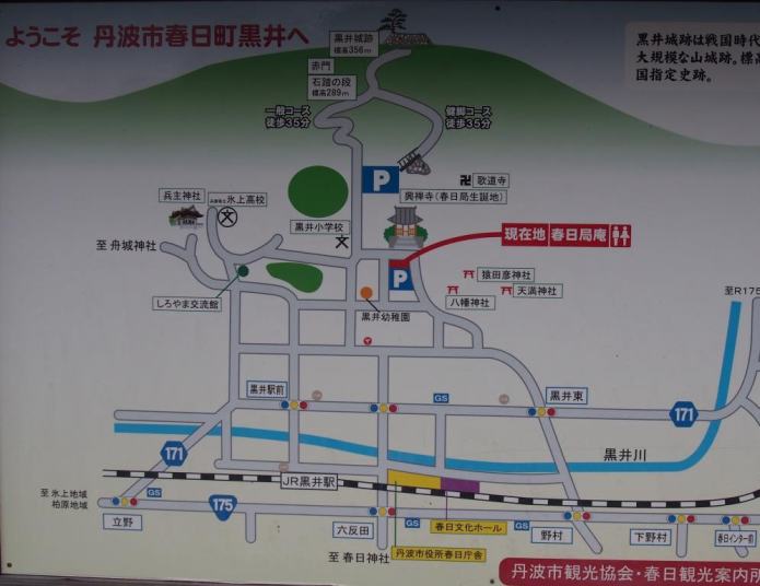 そんな黒井城は春日盆地の中央の城山(猪ノ口山 標高365メートル)の山上に築かれた山城である.その歴史は南北朝時代に遡り,建武二年(1335年)に建武の乱で戦功をあげた赤松貞範が,足利尊氏から春日荘を与えられたのを期にここに築城したことに始まるという.赤松氏の治世は5代120年続き,その後荻野氏が入ったと考えられている.しかし天文二十三年(1554年)に城主荻野秋清が赤井直正に暗殺され,黒井城は直正に乗っ取られる形となった.その後直正は一時織田信長に従い所領を安堵されたものの,信長側の武将である山名祐豊が丹波に侵入するとこれを迎撃し反旗を翻した.