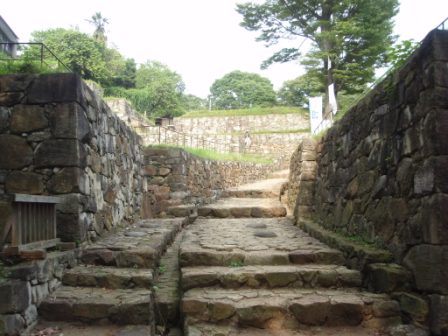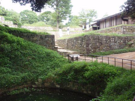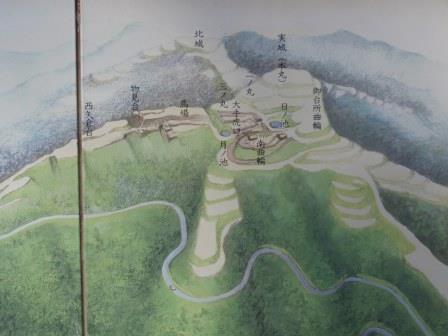 中世城郭ゆえ建物は残っていないものの,石垣や土塁,堀などの遺構があり,また日の池・月の池などが復元 されている.私が登城した8月9日は当初晴天でしたが登城中曇り始め,しかも雷まで鳴り出したため慌てて下山する羽目になった.