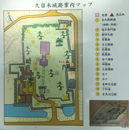 そんな久留米城の縄張りであるが,北西部を流れる筑後川を天然の堀とし,河岸の丘陵地に本丸が置かれ,そこから南側へ直線的に二の丸,三の丸,外郭が並ぶ連郭式平城である.各郭の間には堀が巡らせてあった.本丸には天守は置かれなかったが,御殿や7つの櫓が並んでいた.二の丸は藩主の館,三の丸には家老屋敷や蔵屋敷があったという.現在では二の丸,三の丸はブリヂストンの敷地,外郭は市街地になっており往年の面影はないが,本丸は当時の石垣がよく保存されており当時を偲ぶことができる.