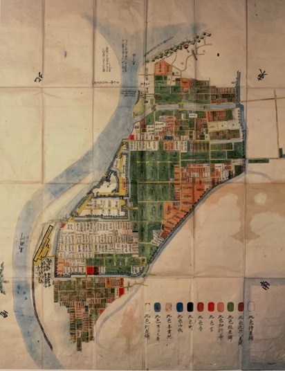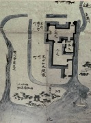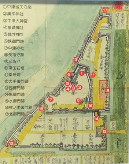 孝高の縄張りは北は周防灘、西は中津川を天然の堀とし、東と南には複数の堀を掘削している。堀には海水を引き入れていたことから満潮時にはかなり水位が上がり、今治城・高松城と並ぶ三大水城と称されている。本丸を中心に北に二の丸、南に三の丸を配した構造をしており、全体を俯瞰すると扇形をしていることから、扇城の別名もある。天守については江戸時代の絵図には描かれていないものの、孝高の書状に天守の名が出てくることから当初は存在した可能性はある。 |