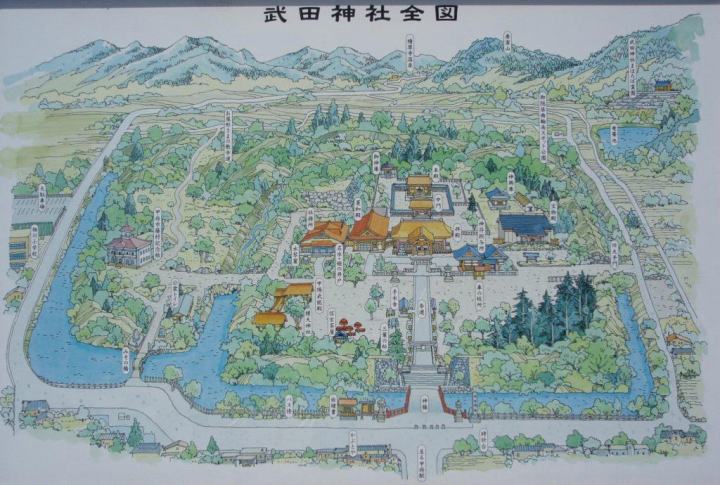 躑躅ヶ崎館跡は現在武田神社となっており,多くの観光客が訪れている.当時の建物などは残っているはずもないが,堀や石垣などから当時の様子を垣間見ることができる.境内にある宝物殿には武田氏ゆかりの品々が展示されており,訪問したときちょうど,あの風林火山の