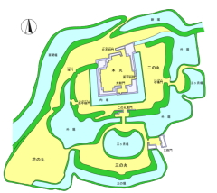 松代城は千曲川を天然の堀とした平城である.ほぼ正方形の本丸を北に開いたコの字型の二ノ丸が囲み,三ノ丸はその南側に位置するという構図になっている(図参照).明治維新後廃城となり,建物はすべて破壊されたため,長らく石垣を残すだけの城郭であったが,20世紀末から堀,門などが再建され現在は海津城跡公園となっている.