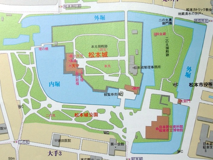 松本城は松本市内の中心部に位置する典型的な平城である.中央の本丸を取り囲むように二ノ丸が,さらにその外側を三ノ丸が囲む形式の輪郭式平城となっている.現在の遺構としては国宝に指定されている天守,石垣,堀,再建された門などがある.また二ノ丸の御殿跡もわかるようになっている.