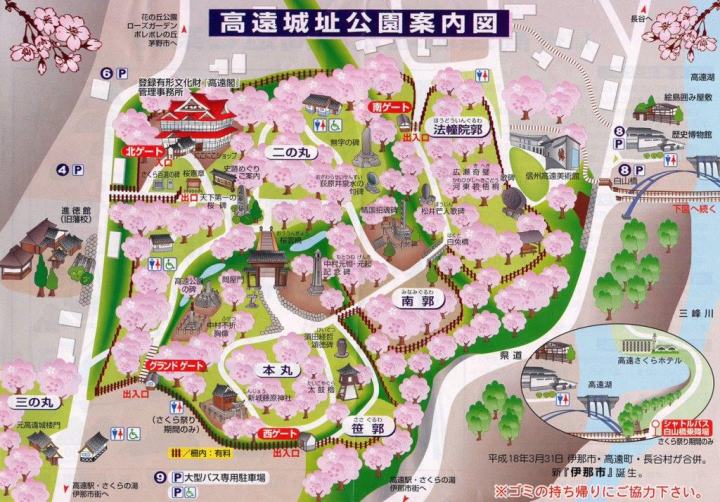 明治維新後廃城となり,当時の建物はほとんど残っていないが,現在は高遠城跡公園として,また桜の名所として春は大勢の観光客が訪れている.遺構としては石垣や堀の他,移築された門や再建された太鼓櫓などがある.