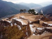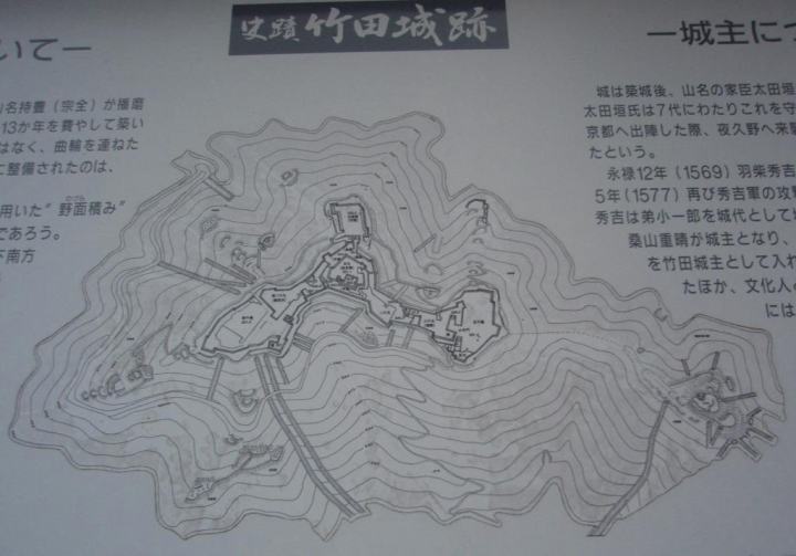赤松広秀は関が原の戦いでは当初西軍についたものの,本戦で西軍が敗れたため東軍に寝返って鳥取城の攻撃に加わった.しかしながら慶長5年(1600年)10月28日に徳川家康の命により切腹,竹田城も廃城とされてしまう.その後城の建物は全て失われたが,山頂の不便な場所が幸いしたのか石垣等の遺構はほぼ当時のまま残され今に至っている. |