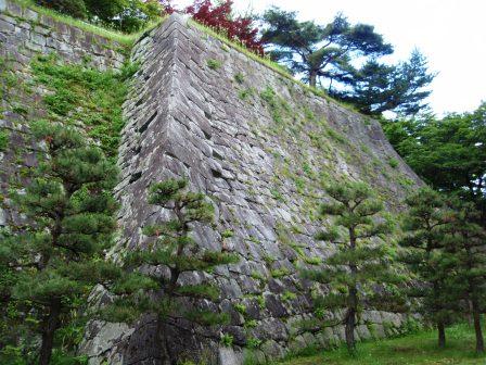 盛岡城は盛岡の中心部にあって川を天然の堀として本丸が,その北に二の丸,三の丸が置かれる構造となっている.本丸には天守台が築かれていたのだが,幕府に遠慮したのか本格的な天守は造られず,御三階櫓が置かれていたようである.城内の建築物の大半は明治以後破壊され,現在では移築の蔵の他は濠や石垣が残るだけとなっている.城跡は現在盛岡城跡公園(旧岩手公園)
