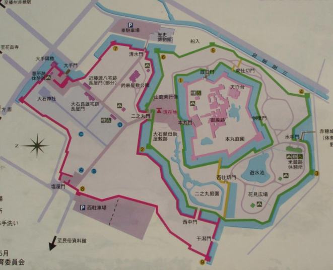 赤穂城へのアクセス: JR播州赤穂駅から徒歩15分または,バスで5分大石神社前下車徒歩数分です.