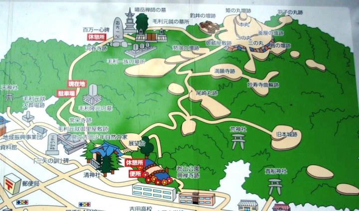郡山城へのアクセス: 広島バスセンターから広島電鉄バス上根・吉田線で1時間30分,安芸高田市役所前下車(960円