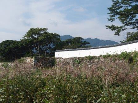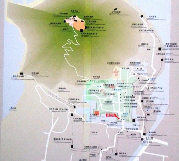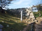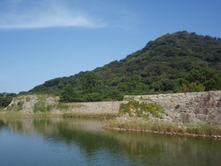 萩城はこの三角州の北西端にそびえる指月山に築城された.山の麓に本丸・二ノ丸・三ノ丸が広がる他,指月山の山頂に詰ノ丸が築かれているのが特徴的である.こうした形態のため,この城郭は平山城に分類されているが,麓部分と山頂部分とのギャップが激しいために,山城・平城2つの城が同居している形であると考えている学者もいるようだ. |