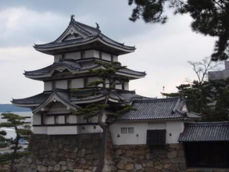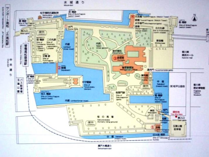 瀬戸内海に面した高松城は水城として知られており,特に外堀,中堀,内堀の水は瀬戸内海の海水を引き込んで利用している.内堀に浮かぶ天守台には 三重五層の天守が江戸時代を通じて建っていた.明治維新後破却されてしまったものの,古写真などの資料が残っていることから,再建を目指す動きもあるようだ.その他遺構として