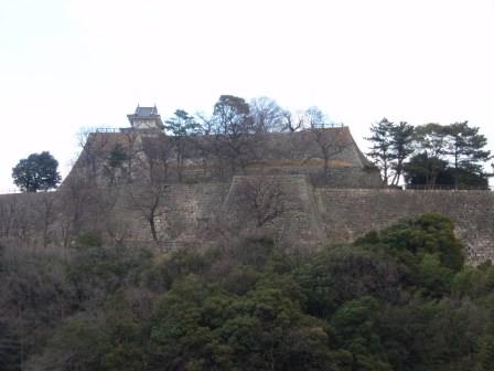 として丸亀城を築いた.山上の本丸に天守が置かれ,その周囲に二の丸と三の丸が配置されている輪郭式の城である.加えてそれらの曲輪が非常に高い石垣の上に乗っているため,遠くから見ると高い石垣の上にそびえ立つ城郭であることがわかる(ギアナ高地ではないが,テーブルマウンテンに乗った城という感じ).城の周囲には堀(当時は内堀)が廻らされている.