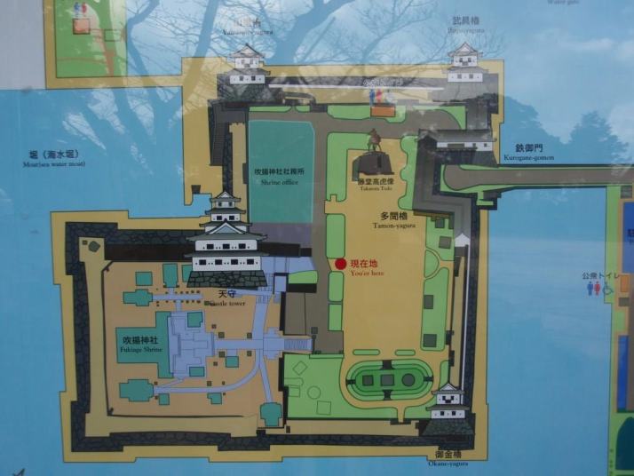 今治城へのアクセス: JR今治駅から徒歩20分程です.また瀬戸内バスにて今治駅前から今治営業所行きで約7分,今治城前下車です(瀬戸内バスHP 時刻表検索から時刻がわかります).