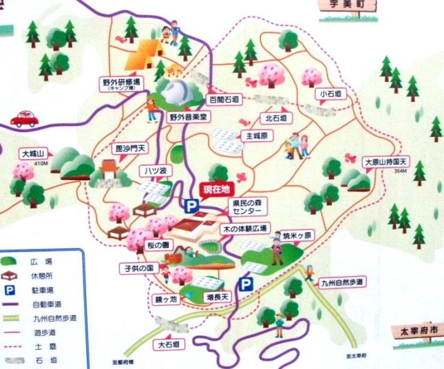 スタンプの設置場所 山頂付近の県民の森管理事務所にあります.麓の太宰府展示館にもあるようです
