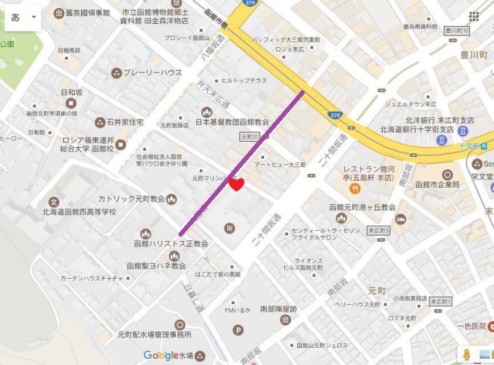 そんな函館は坂の多い街である.市街地の東部に函館山があり,その西側の斜面に街が広がっているためであるが,この街の西側(西部地区)には20か所の坂道があるといわれているが,その中で日本の道100選に選定されているのが,今回のテーマ大三坂通である.この名前は坂下にあった大三印義兵衛の郷宿の家紋に由来するとされる.