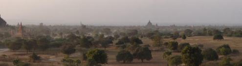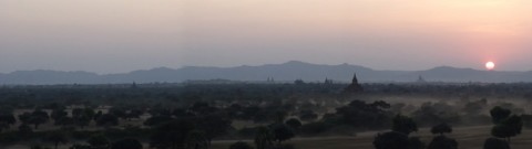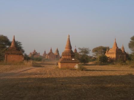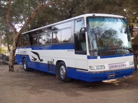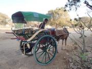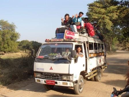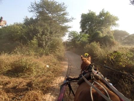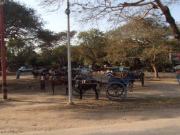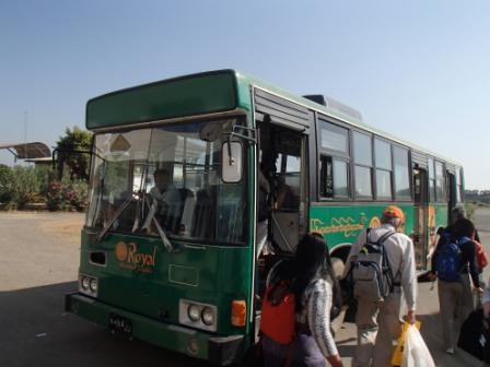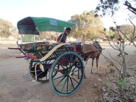 | 時間になりガイド氏と車が迎えに来たのでさっそく乗り込む.この後はバガン周辺の寺院の散策であるが,今度は自動車ではなく,バガン名物の馬車に乗っての散策である.行程はこの街最大規模を誇るダマヤンヂー寺院へ,その後サンセットポイントとして有名なシュエサンド・パゴダに行き,その後夕食という流れになる.まずは市内の馬車プールへ,ここは観光用の馬車がたくさん待機しているスポットである.周辺には馬車の他にここまで観光客を乗せてきたと思われる観光バスの姿もたくさんあったが,日本でおなじみのJRバスほぼそのままのスタイルで停まっていたのは感動だった(笑).日本のバスと写真を撮っていたら,交渉を終えたガイド氏がやってきて我々を1台の馬車に案内してくれた.バガンの観光馬車は御者を含めて4人乗りである.当初はKが前に座ったのだが,重さのバランス云々の問題で結局私が前になった(笑). |