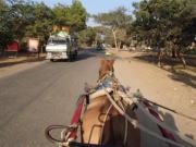 馬車はトコトコと進んでいく.周辺には,よく知られたものから無名なものまでたくさんのパゴダや寺院が聳えていた.自動車からだと車窓から写真を撮るのがけっこう難しいのだが(自動車は速度が速いから),馬車だと楽勝,それゆえ時間がたっぷりある観光客はこの馬車を1日チャーターして市内観光するらしい(あとはレンタサイクルやレンタバイクも多い模様).馬車は最初は自動車も通行するような舗装道路を進んでいたが(明らかに積載オーバーだろうというトラックとすれ違った),途中から馬車専用かと見紛うほどの狭い未舗装道に入っていった.