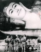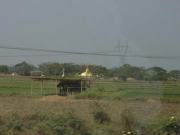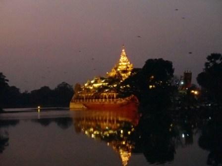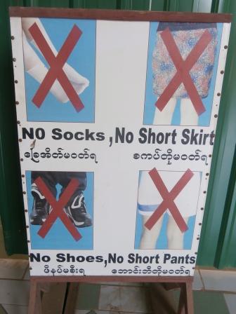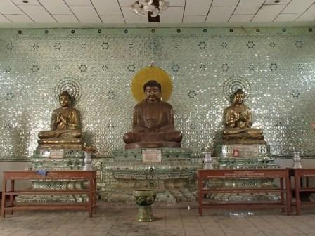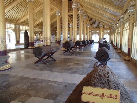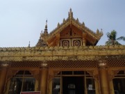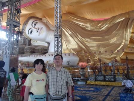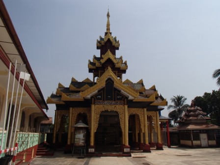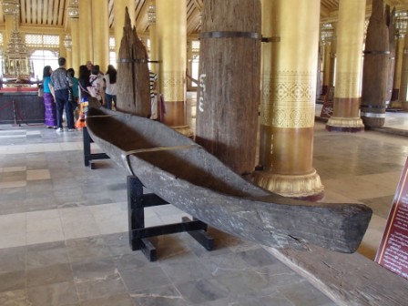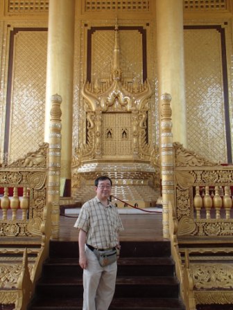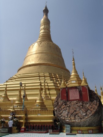 シュエモードーパゴダは巨大な黄金の仏塔を中心にその周囲に何十もの小さな仏塔(こちらも金ぴか)が取り囲む形になってる.さらには東西南北各方位に祈祷の施設やいろいろな展示物を並べるスペースが設けられていた.この展示スペースには日本人が寄進したという鎌倉の大仏のレプリカ(?)も飾られていた.