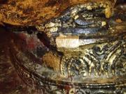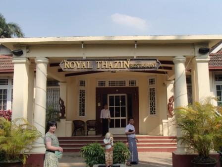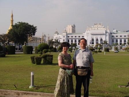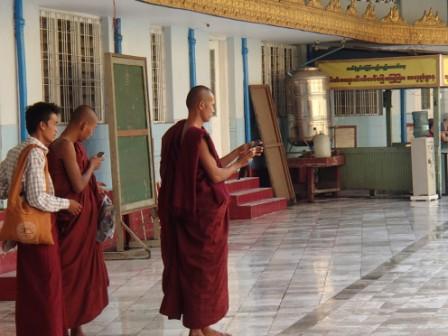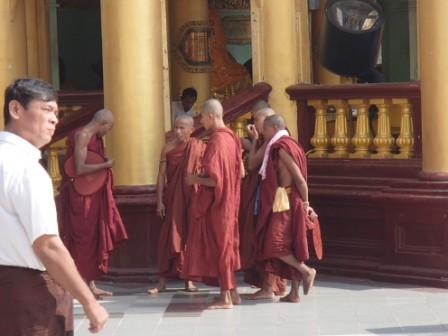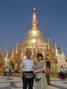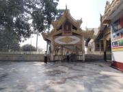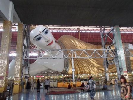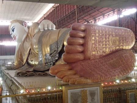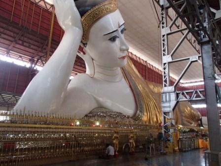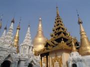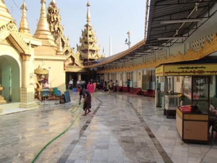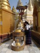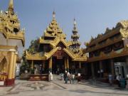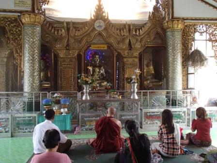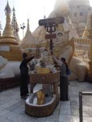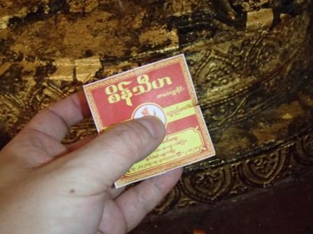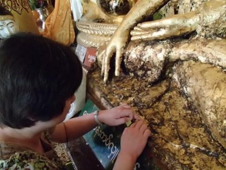 | ちなみにミャンマーは上座部仏教を信仰する人が非常に多いのだが,人々は功徳を積むために様々なことを行う.特にパゴダに金箔を貼ることは一般によく行われていることのようだ(ミャンマーに金ぴかのパゴダが多いのは別に寺院側がやっているわけではなく,人々が個々に金箔を貼っていった結果である).ここでは我々も金箔貼りをしてきた.前々日のチャイティーヨ・パゴダは女人禁制だったため私だけが貼ったのだが,屋外でしかも風が強くて大苦戦だったのだが,ここは屋内でだったので非常に貼りやすかった(金箔そのものはパゴダの売店のようなところで購入する).結局1時間半ほど見学してパゴダを後にした(この頃になると日の光に照らされて床が熱くなり裸足がちょっと辛くなる 笑). |