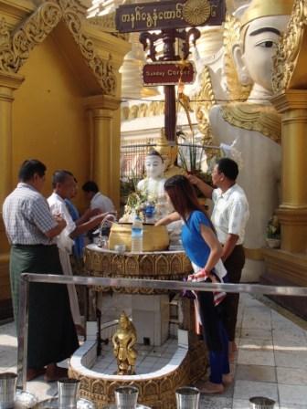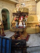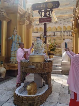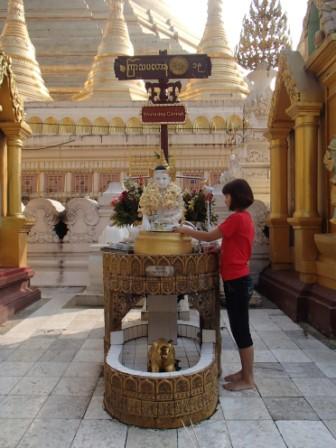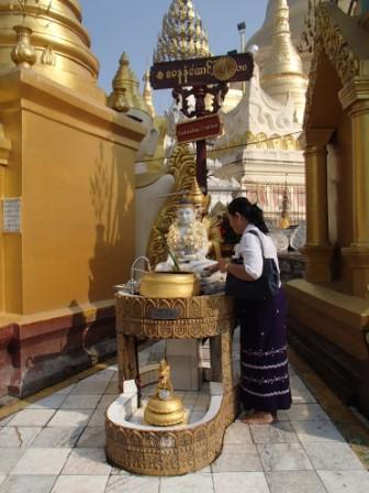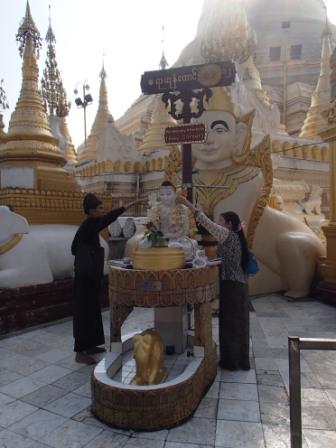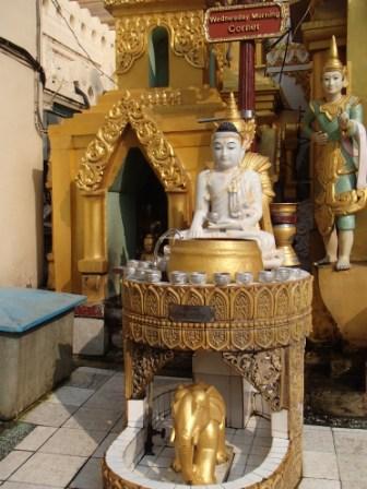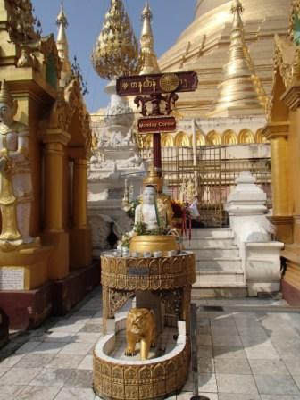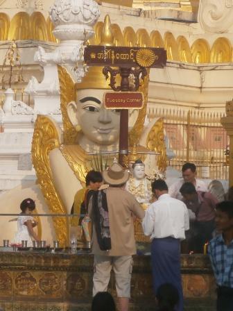| ところでミャンマーには八曜日と 呼ばれる独特の風習がある.現地の人々は自分が生まれた日が何曜日かという点に関心が深く,曜日によって性格や相性も決まると考えられている(日本でいえば星座や血液型みたいなものだろうか).八曜日といっても別に8日サイクルの暦を使っているわけではなく,普通の一週間のうち水曜日を午前と午後に分けて八曜日としているものである.各曜日にはそれぞれ方角やその曜日を守護する動物も指定されていて,人々は自分の曜日の方角や動物を大事にしている.ガイド氏に調べてもらったところ私は月曜日,Kは火曜日とのことだった.ここシュエダゴンパゴダには,それぞれの方角に各曜日の祠が設置されていてお参りをする人々が絶えなかった(自分の曜日と占いはこのサイトで確認できる 八曜日占い). |