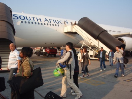 香港に着いたのは夜10時半になろうとする頃である.乗り換え時間は約1時間20分と結構短い.自分たちだけなら5年前のオスロの危機の再燃に恐怖するのだが,添乗員さん付きのツアーなので安心である(笑).案内されるままにやや急ぎ足でゲートに向かった.そしていよいよヨハネスブルク行きのSA287便に搭乗である.南アフリカ航空の機内は,我々が今までに乗った他の飛行機に比べ,エコノミークラスでも一人分のスペースが比較的広いような気がした.また機内には深夜の便ということもあるのか,アイマスクなどと一緒に歯磨きセット(歯ブラシと歯磨き粉)もセットされていたのがありがたかった.見渡すと乗客の大半は非アジア系の人々だった.