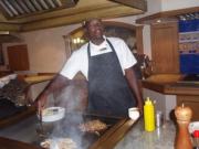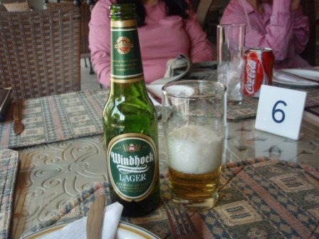 まず目指すのはこの日の宿泊先である,「サファリ・コート・ホテル」である.すでに時刻は午後3時近くになっているのだが,ここのレストランで遅い昼食を摂ることになっているのだ.ランチメニューはハンバーガーとサンドイッチ程度という軽食ではあったが,ハンバーガーを注文してみるとこれがまたでかい!かなりのボリュームである.食事とともにビールも頼んだが,このとき出てきたビールがこの後何度もお世話になるウィントフック・ラガーであった.ナミビアはかつてドイツの植民地だったこともあり,その影響から美味しいビールが飲めるということのようだった. |
