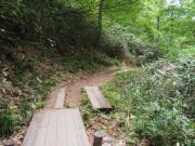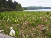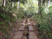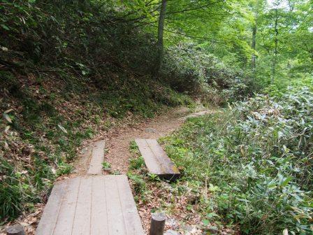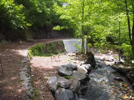 三平峠からはひたすらな下りとなる.とはいえ,壊れかかった木道,石がごろごろする道,沢水があふれた個所などお世辞にも歩きやすいとは言えない個所も多く,油断するとケガをする恐れがあり慎重に下っていく.だいたい1時間ほど歩いて前方に建物が見えてきて,足元の路面が普通の砂利道になった.尾瀬を去った寂しさよりも,なんか人里に戻ってきた安心感が上回る感じだ.やがて砂利道が舗装道路になってまもなく,一ノ瀬の休憩所に到着となる.