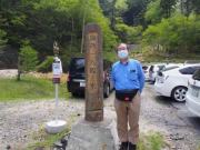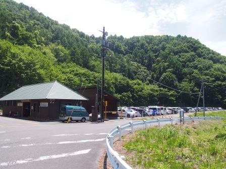 一ノ瀬休憩所は現在休止中だが,休憩スペースとしての利用は可能,さっそく荷物を置いて休憩である(長い悪路の下りで結構へばっていた).ストレッチをして外に出ると,大清水行きと書かれたマイクロバスが停まっているではないか.もしかしてこれは… と思い近くにいた運転手っぽい人に,「これ,大清水に行くんですか?」と聞いたところ,「そうです,今日から運行なんです」との答えが.一ノ瀬−大清水間は自動車が通れる道だが,基本的に許可車以外は通行禁止,夏季のみシャトルバス運行となっている.事前に調べた限りでは2021年のバス運行のスケジュールは発表されておらず,今回は大清水までは徒歩で行かなくてはならないと覚悟していた.が,バスが運行されているとなれば話は別! 聞いたら5分後に出発するということで急いで乗ったのは言うまでもない.