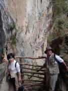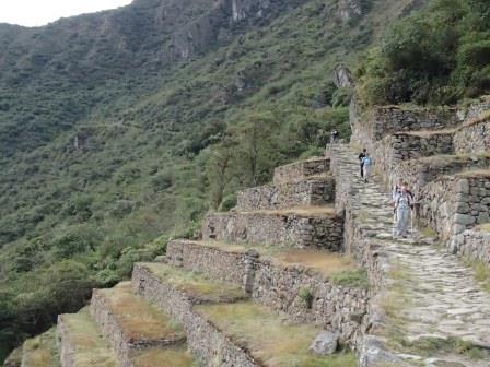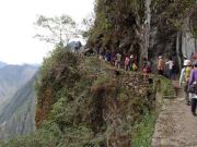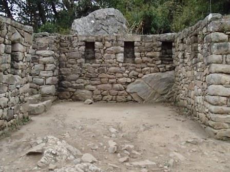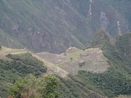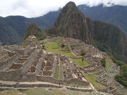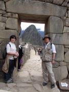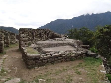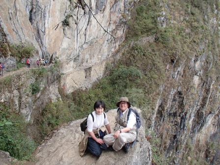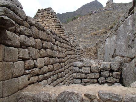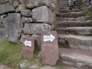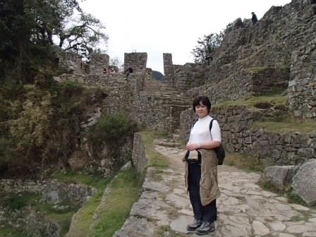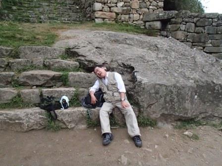 その後はそのままホテルに戻る人,添乗員さんと一緒に遺跡を歩く人,自由行動の人に分かれてしばしの解散となる.我々は添乗員さんと一緒のコースに入り,昨日行かなかった遺跡を見学した.マチュピチュ遺跡に関しては過去には砦などの軍事施設だったという説もあったが,結構長い年月をかけて徐々に建設された形跡があることから(石垣が古いもの精巧なものが混在しているなど),近年では宗教施設だったという説が有力である(このほか夏の離宮だったとも.いずれにせよ水源の数などから実際にここに住んでいたのは最大でも1000人は超えないといわれている).添乗員さんによるとマチュピチュ遺跡の実態については,インカ人が文字による記録を残していない以上,正確なことは誰にもわからず,所詮言ったもの勝ちなのだそうだ.たとえば天体観測の石といわれる円形の2つの石があるが(ここに水を張って星を観察したという説がある),実は単なる石臼だったのではないかという説もあるし,現在コンドルの神殿と呼ばれているところも,当初発見者のビンガムは牢獄だったと考えていたそうだ.