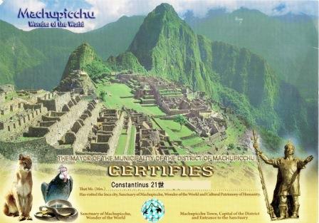マチュピチュ訪問証明書