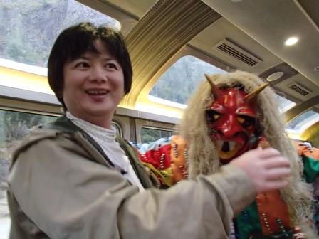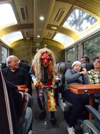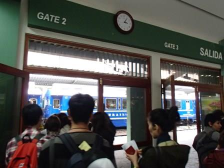 | 列車を待つ観光客で大賑わい(マチュピチュから他の都市に行くにはこの列車に乗るしか方法がないので当たり前なのだが…),現地ガイドから各自チケットを受け取り出発の時を待っていた.往路は聖なる谷のオリャンタイタンボからの乗車したのだが,復路はクスコ近くのポロイ駅まで乗り通す行程である(約3時間半). |