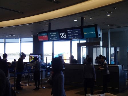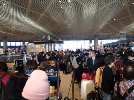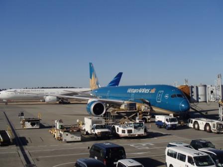 夜が明けて2月3日出発の朝である.この日の空港集合時間は7時30分ということで朝食は摂らずにさっさとチェックアウト,そのまま日暮里駅から京成スカイライナーに乗って成田空港に向かう.到着後は事前に送っておいた荷物を受け取ってJTBの団体カウンターに行った(団体とはいいつつ今回は我々2人だけのツアーなのだが 笑).ここでeチケットを受け取り,今度はチェックインのためにベトナム航空のカウンターに向かうが,なんと激混み!! まさに長蛇の列だった(ハノイ行きとホーチミン行きがほぼ同時に手続きされていたためらしい).それでも待つこと30分くらいでどうにか手続きは完了した.