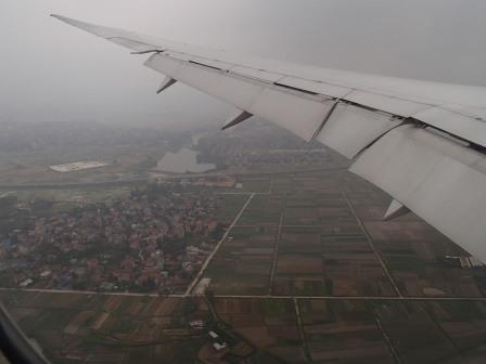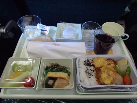 | 9時15分に搭乗開始となり機内へ,この日の飛行機は最新型のボーイング787だった.定刻に出発し本州を関東から関西,中国地方へと横断して東シナ海に抜けるルートだ.安定飛行に入るとさっそく飲み物と昼食のサービスが始まった.食事は和食と洋食の選択で自分は和食でKは洋食,飲み物は2人ともワインである(笑).昼行便なので無理に眠っていく必要はないのだが,昨夜の睡眠時間が少なかった(日暮里のホテルに入ったのが0時過ぎ)こともありうつらうつらしながら過ごしていた. |