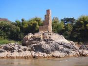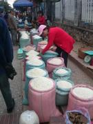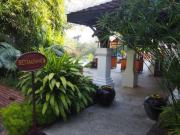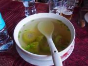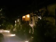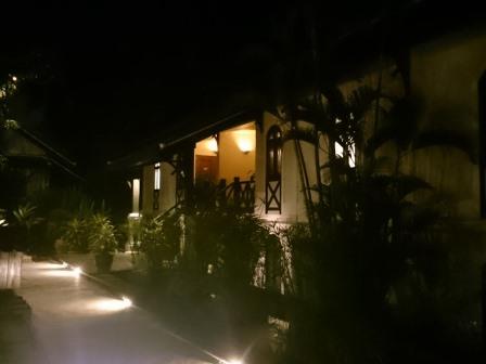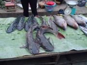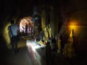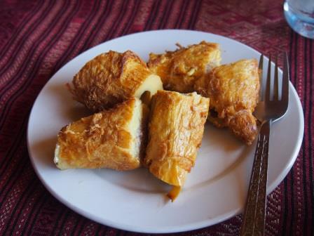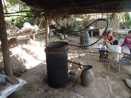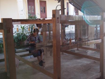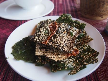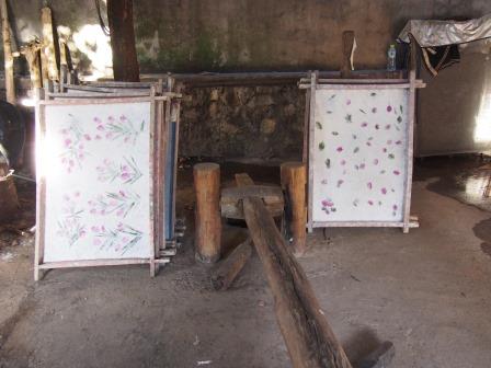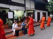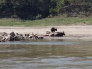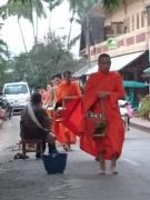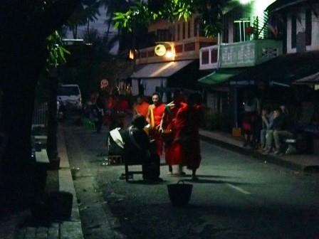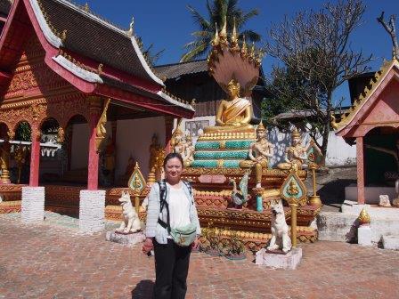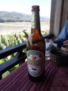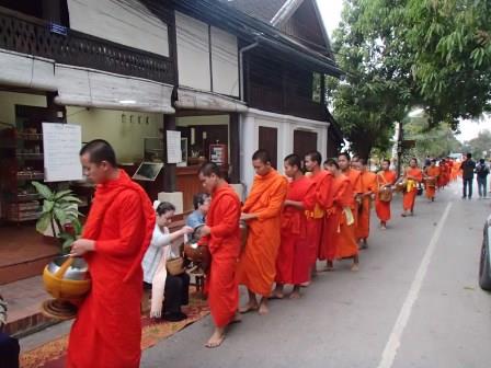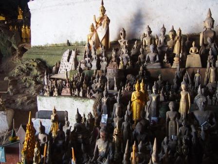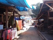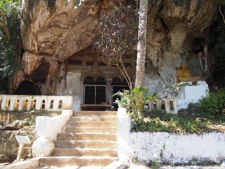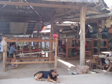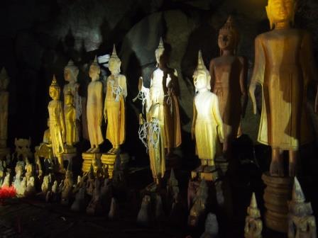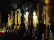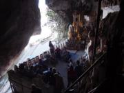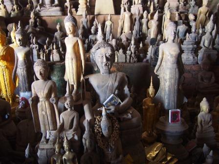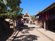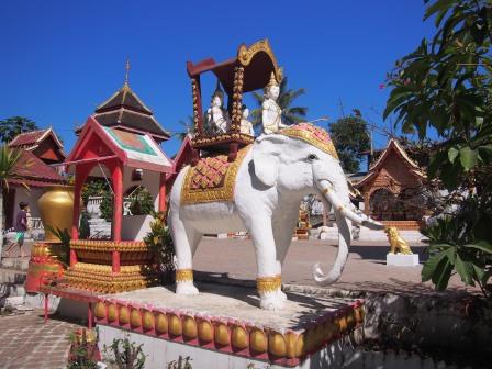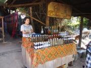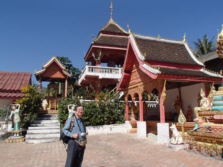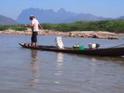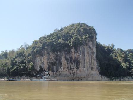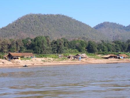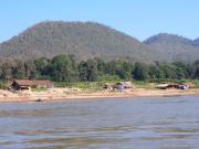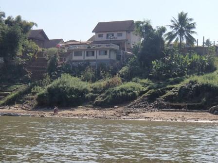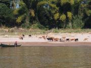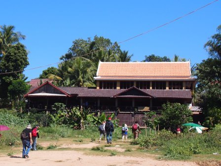 メコン川はチベット高原に源流を持ち,南シナ海に至る全長4000kmを誇る東南アジア最大の大河である(世界でも12番目).河口付近なら,それこそ向こう岸が見えないレベルの大きさであろうが,中流域でしかも乾季のこの時期はさほど大河という雰囲気は感じない.川の水は茶色がかっている(これは周辺の土壌であるラテライトが流れ込んでいるため).川の流れはゆったりで快適な船旅だ.周辺にはトタン屋根の民家や,ちょっと立派な別荘風の建物が見える.川べりでは釣りをしている現地の人や,牛が放牧されている様子など長閑な光景が広がっていた.こうした中を1時間半ほどゆったりと進んで,まずは小さな村にて下船する. |