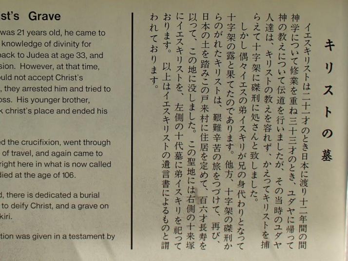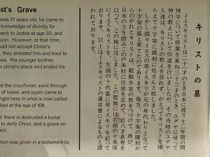 られたのはイエスではなく弟のイスキリであり,イエス本人は日本に渡り,今の新郷村に住みついて106歳の天寿を全うしたというのである.その証拠として挙げられているのが以下のものである.