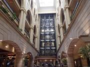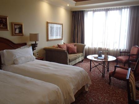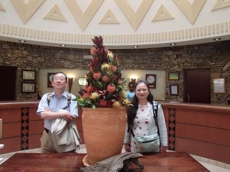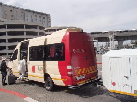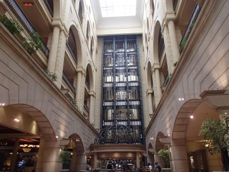 全員乗り込んだところで出発,この日はホテルに直行である(そういえばもう夕方近い).この日宿泊するのは市内サントン地区にあるミケランジェロという5つ星ホテルである.世界的に治安が悪いことで知られるヨハネスブルクの中でサントン地区は比較的治安が良いとされ,特に大ショッピングセンターであるサントン・シティや隣接するマンデラスクエア周辺は武装警備員に守られ,外国人も安心して歩けるスポットとなっている.我々が宿泊するミケランジェロはマンデラ・スクエアに隣接するホテルだった(ここのオーナーはイタリア人の名前が好きらしく,系列でダ・ビンチやラファエロもあるらしい).中に入るとロビーが吹き抜けになっているところに高級感がある.まずはいったん部屋に入り荷物を解く.その後希望者はロビーに戻り,ガイドさんの案内でショッピングセンターを見学することになる.マンデラ・スクエアはかつてサントン・スクエアと呼ばれていたが,アパルトヘイト撤廃後にこの国の大統領となったネルソン・マンデラの偉業を称えて改称されたものであり,マンデラ氏の像も立っている.