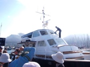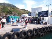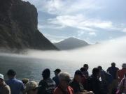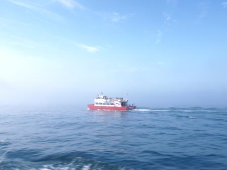 8時40分に港に到着,船は100人は優に乗れるサイズの中型船である.乗船しようとしたら,さっそく付近にオットセイの姿が… 写真を撮っていたら現地人がなにやらチップを要求している.ただ飼いオットセイじゃあるまいに,彼の所有物でもあるまいと無視した.我々の乗船は比較的早かったので,中央の見晴らしがよさそうな場所を確保できた.ふと見ると湾の対岸の山に霧が立ち込めていて風情を感じる.