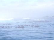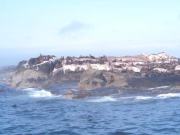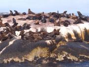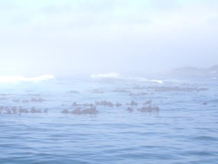 その後も続々と客が乗り込んできて,9時頃に出航となる.湾内ということもあって海は非常に穏やかである.しばらくするとさっそくオットセイの群れに遭遇した.オットセイといえば一匹の強いオスが多数のメスを独占しハーレムを形成,エサの確保に有利な海岸部に住み,その他のオスはオスどうして群れを作って内陸のやや不便なところに生活するという自然界の厳しい掟に従った社会として知られる(ライオンやインパラなどサバンナの生き物にも通じる).小さな島にたくさんのオットセイがひしめくさまは壮観である.一方で島の付近には巨大な海藻(昆布のようなもの?)もたくさん漂っていた.