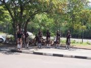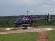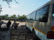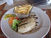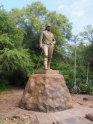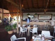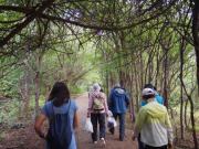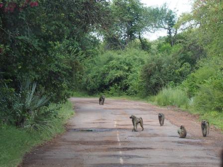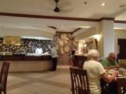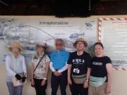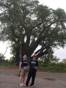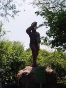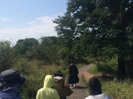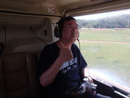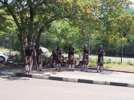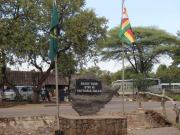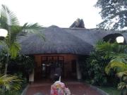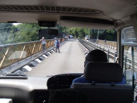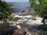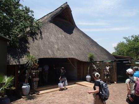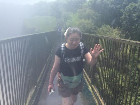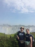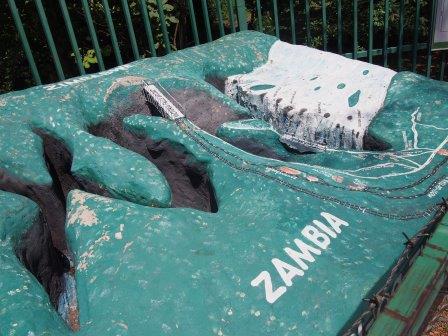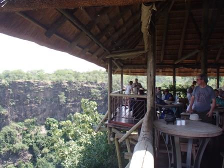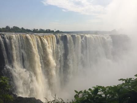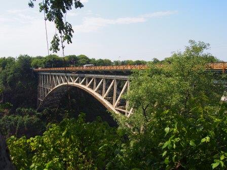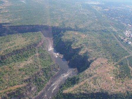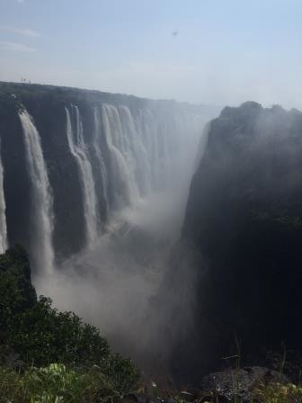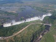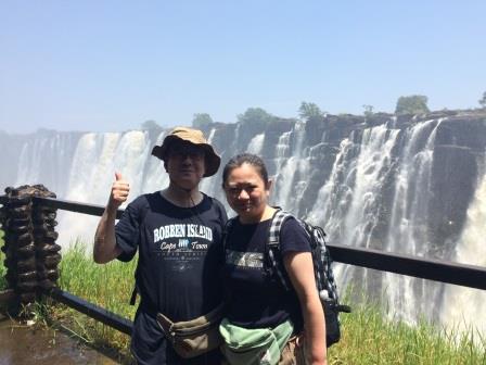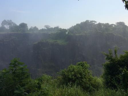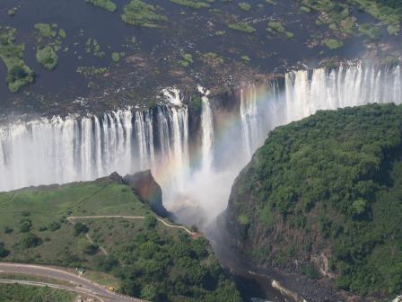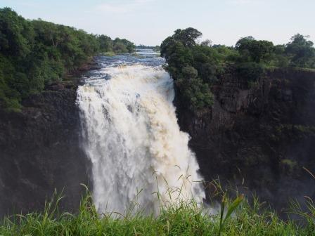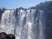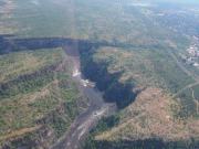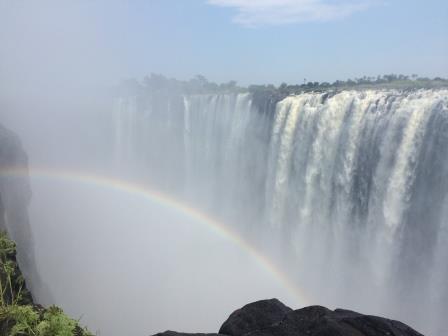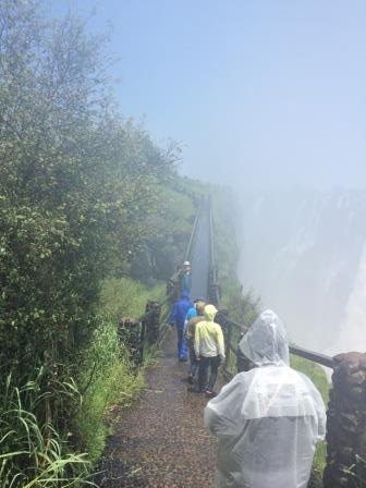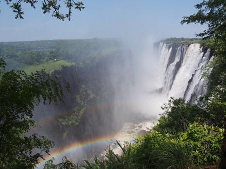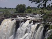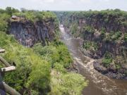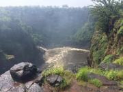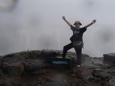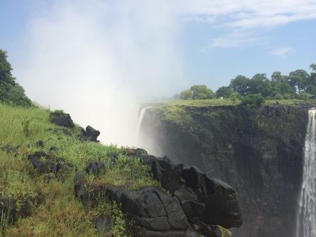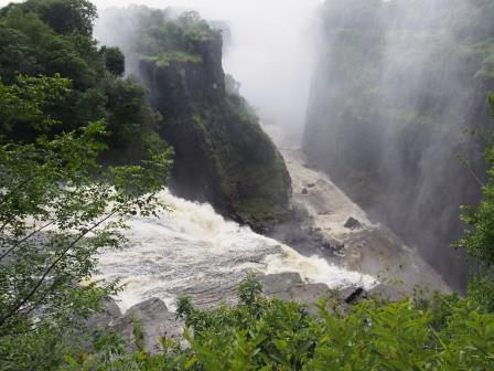 | メインフォールズが終わるとリビングストンアイランドと呼ばれる岩盤地帯になる.そこを過ぎると滝の中で一番大規模とされるホースシューフォールズへ,ここも大量の水が谷底に落下して水煙を上げている.中間期のこの時期でこの水量だから多水期はいったいどんな状態なんだろうと感じた(光線の加減によって虹もかかる).そこからしばらく歩いていくと,ビクトリアの滝ジンバブエ側の最終地点,デンジャーポイントに到着,ここは1700メートルの滝幅があるビクトリア・フォールズから落ちた水がすべて集まってザンベジ川の下流に流れていく滝壺と川に挟まれた突端部で,柵も何もない文字通りデンジャー(危険)なスポットである.当然記念写真をということで慎重に岩場に足をかけて「ハイ!ポーズ」とやっていたら,なんと岩に引っ掛けてサンダルの鼻緒が取れてしまった(泣).現地ガイドが応急修理してくれたのだがすぐにまた壊れてしまい,以後裸足で歩く羽目になった(遊歩道がきちんと舗装されていたので助かった). |