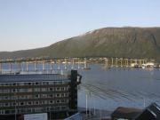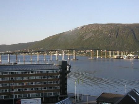 午後10時30分のトロムソ.正面に見える長い橋がトロムソ橋である.その手前の建物が1999年に泊まったホテル |