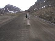 チェックアウトを済ませ,荷物を預けて外に出た.街の南部にあるものといえば映画館とギャラリースバールバルである.ギャラリーは12時にならないと開かないのでまず映画館に行くことにした.映画館はロングイヤー川の対岸にあるためホテルを出てから一昨日も通った橋を渡る.ここを道なりに右に行けば博物館や教会に行くわけであるが,今日は左に南下する.左に曲がる道は未舗装の砂利道であった.何もない荒野を一本の砂利道が続いている. |