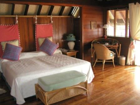 そして我々はシャワーを浴び,夕食をとりにレストランへと向かった.パンの実のスープと「ロブスターのラビオリ」(ホワイトソースがかかった海老餃子のようなメニューであった)をとり,ワインを飲んだ.ジュール・ベルヌの「海底二万マイル」やTVアニメの「ふしぎの島のフローネ」にも登場し,ガイドブックでも見かける「パンの実」を一度食べてみたいと思っていたが,スープに加工された形とはいえ,とりあえず食べることはできた.しかし原形に近い形で(現地の人はこの実を蒸し焼きにして,主食の一つとして食べているらしい.芋のような食感だそうだ)食べることは,今回の旅行中は残念ながらできなかった.(2006年現在,未だにこの夢は実現していない)そしてその夜は,出発前夜当直だったこともあり,早く寝ることにした. |