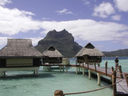 タヒチ名物(?)水上コテージ群の向こうにオテマヌ山が見える